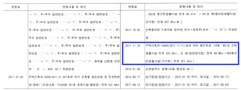 보시면 2011년 1월 25일, 원래 301호에 있던 운동시설(볼링장)과 302호의 종근린생활시설이 합쳐져서 제2종근린생활시설(고시원) 되었음을 확인할 수 있습니다. 따라서 해당 고시원은 2011년 6월 29일 이전 설립된 고시원이기 때문에 바닥면적 합계 1,000㎡ 미만이므로 적법하다고 할 수 있습니다.