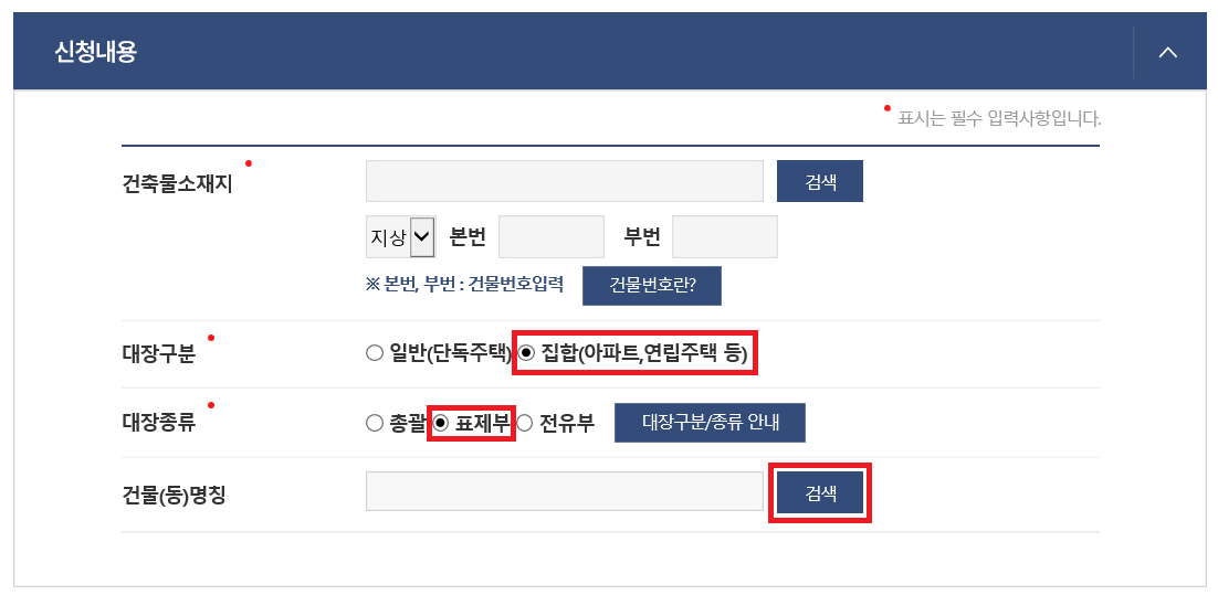정부24 홈페이지로 접속한 후 건축물소재지(주소)를 넣고 대장구분에는 집합(아파트, 연립주택 등), 대장종류는 '표제부'를 체크한 후 건물(동)명칭 검색 버튼을 클릭합니다.