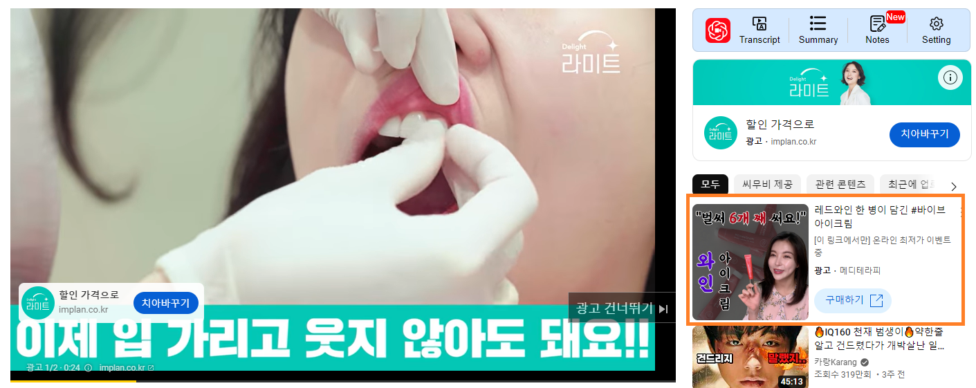 또한 눈가의 주름에 대하여 고민하고 있거나 아이크림을 구매하기 위해 알아보고 있다면 영상 오른쪽에 있는 광고를 클릭하게 될 것입니다. 이런 식으로 유튜브를 시청할 때 광고는 의식적으로, 무의식적으로 시청자들의 관심과 선택을 유도하게 합니다.