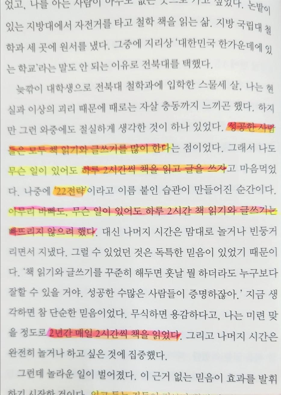 성공한 사람들은 모두 책읽기와 글쓰기를 많이 한다. 아무리 바빠도, 무슨 일이 있어도 하루 2시간 책읽기와 글쓰기는 빠뜨리지 않으려 했다. 놀라운 일이 벌어졌다. 읽고 듣는 것들이 전보다 훨씬 잘 이해되었다. 무엇을 보든 본질 또는 핵심이 금방 파악되고 스스로 기준이 잡히기 시작했다.(p42)