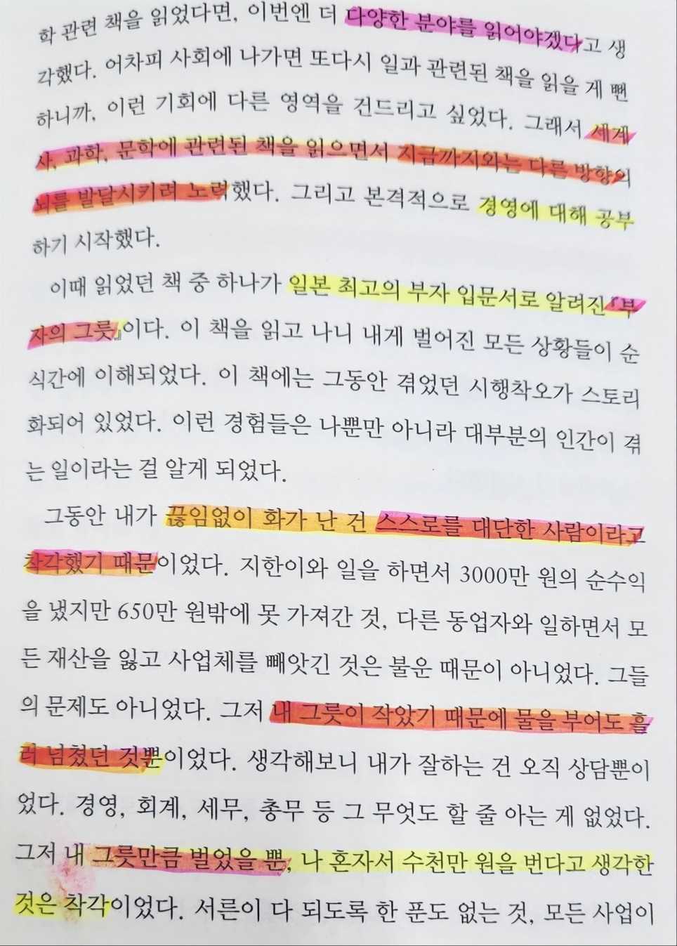 그동안 내가 끊임없이 화를 냈던 것은 스스로를 대단한 사람이라고 착각했기 때문이다. 망한 것은 불운 때문도, 주변 사람들 때문도 아니었다. 그저 내 그릇이 작았기 때문에 내 그릇만큼만 벌었고 물을 부어도 흘러 넘쳤던 것뿐이었다. 누구의 탓도 아니었다. 그게 내 실력이었다.(p59)