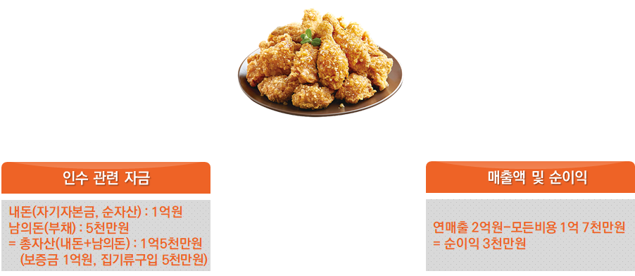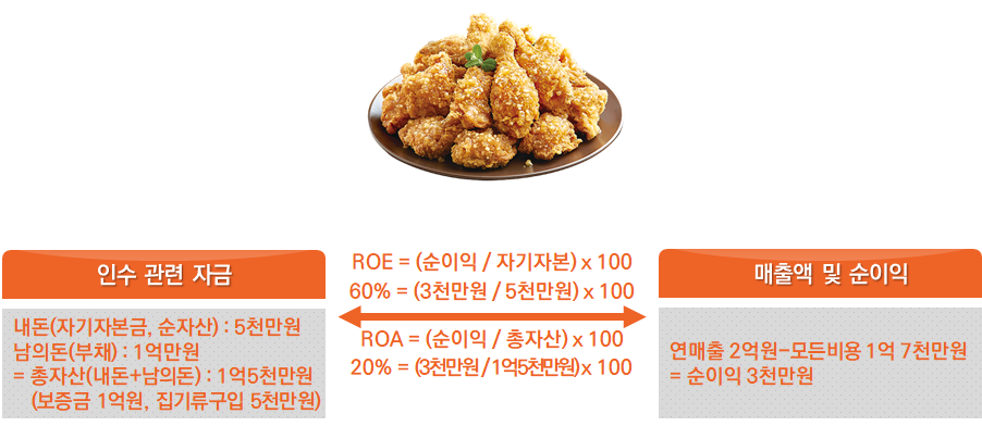사례 : 저는 오랫동안 눈여겨봤던 상가 건물에 치킨집을 1억 5천만원에 창업했습니다. 보증금이 1억이고 치킨집을 세팅하기 위해서는 5천만원 정도가 필요합니다. 하지만 제 수중에 가진 돈을 탈탈 털어도 1억밖에 없었습니다. 때문에 신용대출을 통해 은행으로부터 5천만원을 받아 1억 5천만원의 자금을 확보했습니다. 일단 보증금 1억 원을 건물주에게 드리고, 나머지 5천만원은 내부 시설공사(인테리어)와 치킨을 튀기기 위한 각종 집기류, 치킨의 원료가 되는 닭과 양념 등을 구입하는 데 사용했습니다. 그리고 1년 동안 열심히 장사를 하니 연매출 2억이 되었습니다. 거기서 직원들 인건비 및 각종 재료구입비 등등 이것저것 나가는 돈들을 모두 빼니 3천만원의 순이익이 생겼습니다. |
