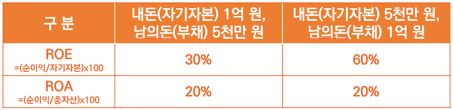 앞서 내돈이 1억 원이었을 때 ROE는 30%였습니다. 하지만 내돈이 5천만 원일 경우 ROE는 무려 60%가 됩니다. 무려 2배가 증가한 수치이죠? 하지만 ROA는 20%로 동일합니다. 어차피 내돈(자기자본금)과 남의돈(부채)를 합친 금액은 1억 5천만원으로 똑같기 때문입니다.