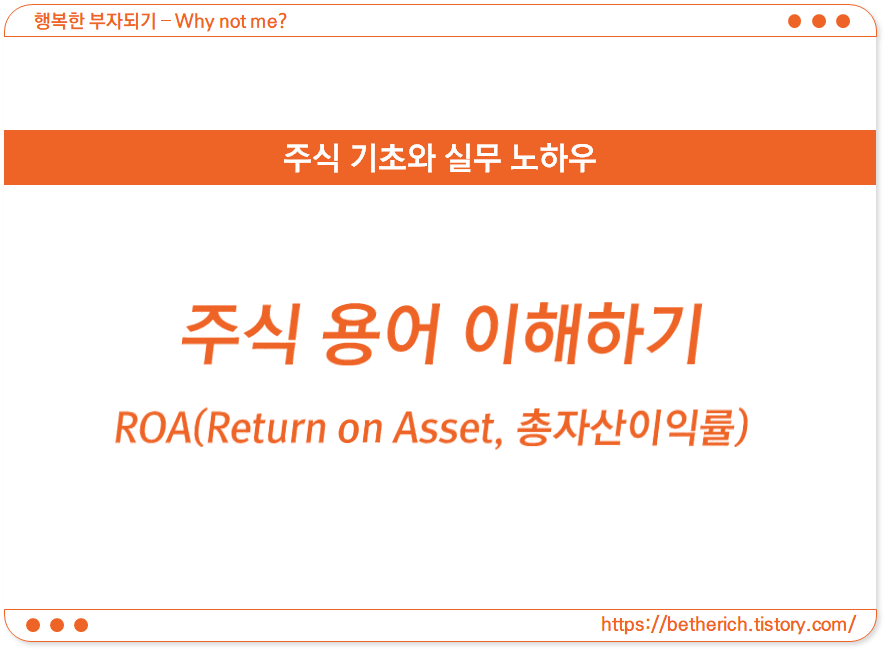 앞서 언급드린 ROE에 이어 이번에는 ROA(Return on Asset) 입니다. 한글로는 '총자산이익률, 자산수익률, 총자산 순수익률' 등으로 부릅니다. 인터넷에 'ROA'로 검색해 보니 '총자산 대비 얼마만큼의 이익을 냈는지를 나타내는 지표로 '(당기순이익 ÷ 총자산) × 100'의 공식으로 산출된다.'라고 합니다.(출처 : 네이버 지식백과)
