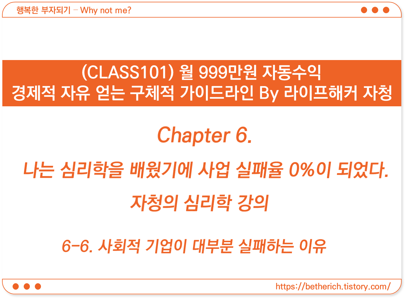 | (클래스101 자청) 월 999만원 자동수익, 경제적 자유 얻는 구체적 가이드라인 6-3. 자의식 해체 (0) | 2023.06.02 |