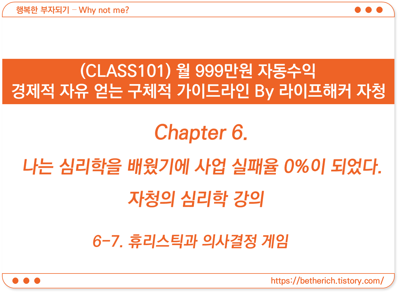 자청 님은 본인의 현재 상황이나 처지에 만족하지 못한다면 본인의 의사결정력에 문제가 있다는 것을 의미한다고 합니다. 그리고 의사결정력을 높이기 위해서는 '휴리스틱(의사결정을 할 때 몇 가지 정보로만 어림짐작하여 결정하는 것)에 대하여 공부해야 한다는 것을 강조하고 있습니다. 휴리스틱은 어떤 것이 현명한 판단임에도 불구하고 인간의 인지적 오류와 심리적 특성 때문에 현명한 판단에서 벗어난 선택을 하는 것이라고 이해하면 될 것 같습니다.