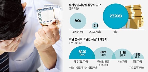 유상증자를 통해 자본시장에서 자금을 조달하는 기업이 크게 늘어나고 있다. 대출 금리가 높아지고 채권 발행이 어려워지자 주주들을 통해 자금을 확보하려는 것으로 분석됐다. 하지만 증자 과정에 주주가치가 희석되면서 개미 투자자들이 피해를 보고 있다는 비판도 제기되고 있다.(유상증자 개념, 주가에 미치는 영향 아래 링크 참고)