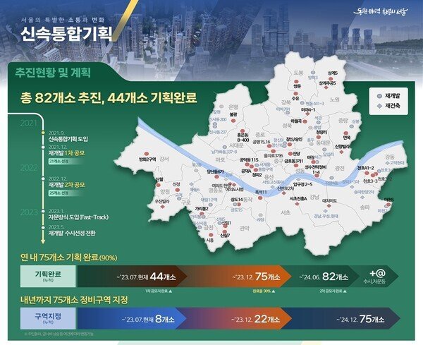 한편 시는 연내 75곳(90%), 내년 상반기까지 82곳(100%)의 신통기획을 모두 마무리한다는 목표다. 기획 확정 후 주민 동의율 67% 조건을 충족해 정비구역 지정까지 완료한 구역은 현재 8곳에서 연내 22곳, 내년 말까지 75곳으로 늘릴 방침이다.