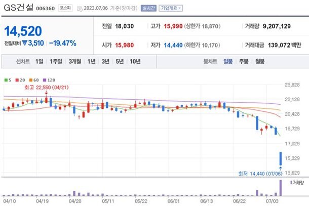 6일 한국거래소에서 GS건설은 전 거래일 대비 19.47%(3510원) 내린 1만4510원에 거래를 마쳤다. 52주 신저가를 기록한 것은 물론, 시가총액도 하루 만에 1조5430억 원에서 1조2426억 원으로 3000억 원가량 증발했다.