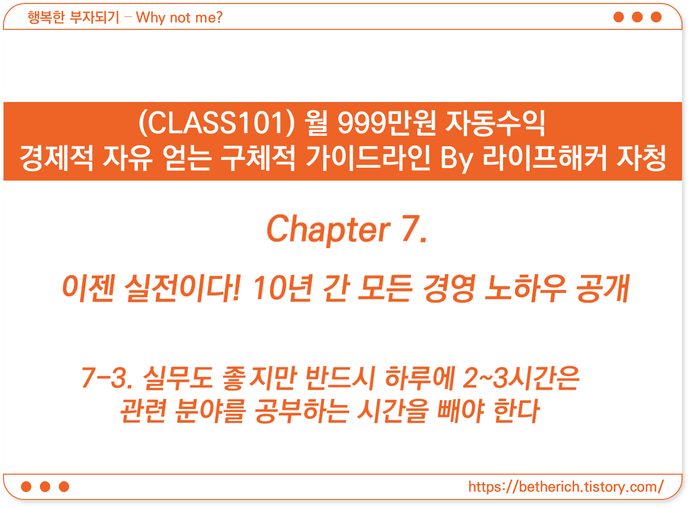 만약 하루에 10시간씩 일하던 것을 하루 8시간 일하고 2시간을 공부하는 데 쓴다면 어떨까요? 그만큼 실력이 늘어 고객들에게 만족스러운 가치를 제공하고 그것이 입소문을 타 초과 수요가 발생하여 돈을 많이 벌고 경제적 자유를 얻을 확률이 높아지게 됩니다. 당장의 매출, 수익이 줄어들 것을 걱정하기보다는 중장기적인 관점에서 하루에 2~3시간이라도 짬을 내서 공부를 해야 합니다.