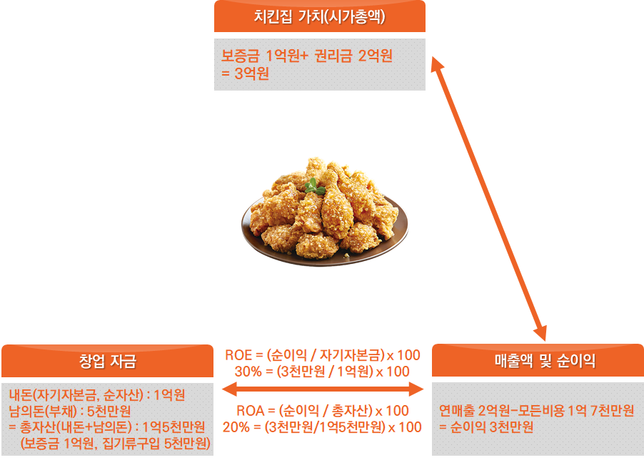 사례) 오랫동안 눈여겨봤던 상가 건물에 치킨집을 1억 5천만원에 창업했습니다. 보증금이 1억이고 치킨집을 세팅하기 위해서는 5천만원 정도가 필요합니다. 하지만 제 수중에 가진 돈을 탈탈 털어도 1억밖에 없었습니다. 때문에 신용대출을 통해 은행으로부터 5천만원을 받아 1억 5천만원의 자금을 확보했습니다. 일단 보증금 1억 원을 건물주에게 드리고, 나머지 5천만원은 내부 시설공사(인테리어)와 치킨을 튀기기 위한 각종 집기류, 치킨의 원료가 되는 닭과 양념 등을 구입하는 데 사용했습니다. 그리고 1년 동안 열심히 장사를 하니 연매출 2억이 되었습니다. 거기서 직원들 인건비 및 각종 재료구입비 등등 이것저것 나가는 돈들을 모두 빼니 3천만원의 순이익이 생겼습니다.