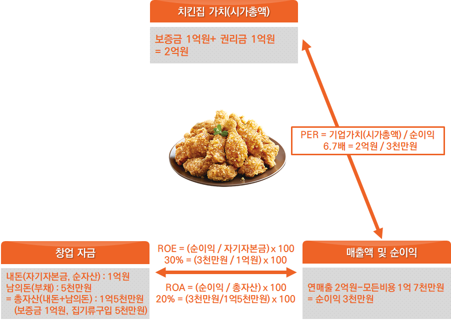 '치킨집 가치'를 '순이익'으로 나눈 수치 = [기업가치(시가총액) / 순이익] = 2억원 /3천만원 = 6.7배