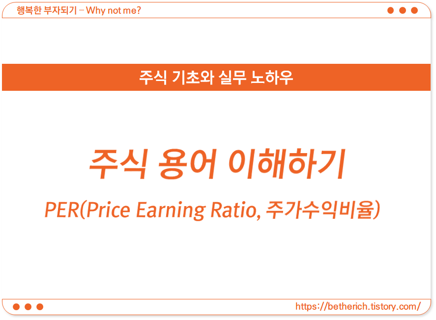 이번에는 PER(Price Earning Ratio) 입니다. 한글로는 '주가수익비율, 주가수익률' 이라고 부릅니다. 인터넷에 'PER'로 검색해 보니 '주가를 주당순이익(EPS)으로 나눈 수치 또는 시가총액을 순이익으로 나눈 수치로 계산되며 주가가 1주당 수익의 몇 배가 되는가, 시가총액이 순이익의 몇 배가 되는가를 나타낸다.'라고 합니다.(출처 : 네이버 지식백과)