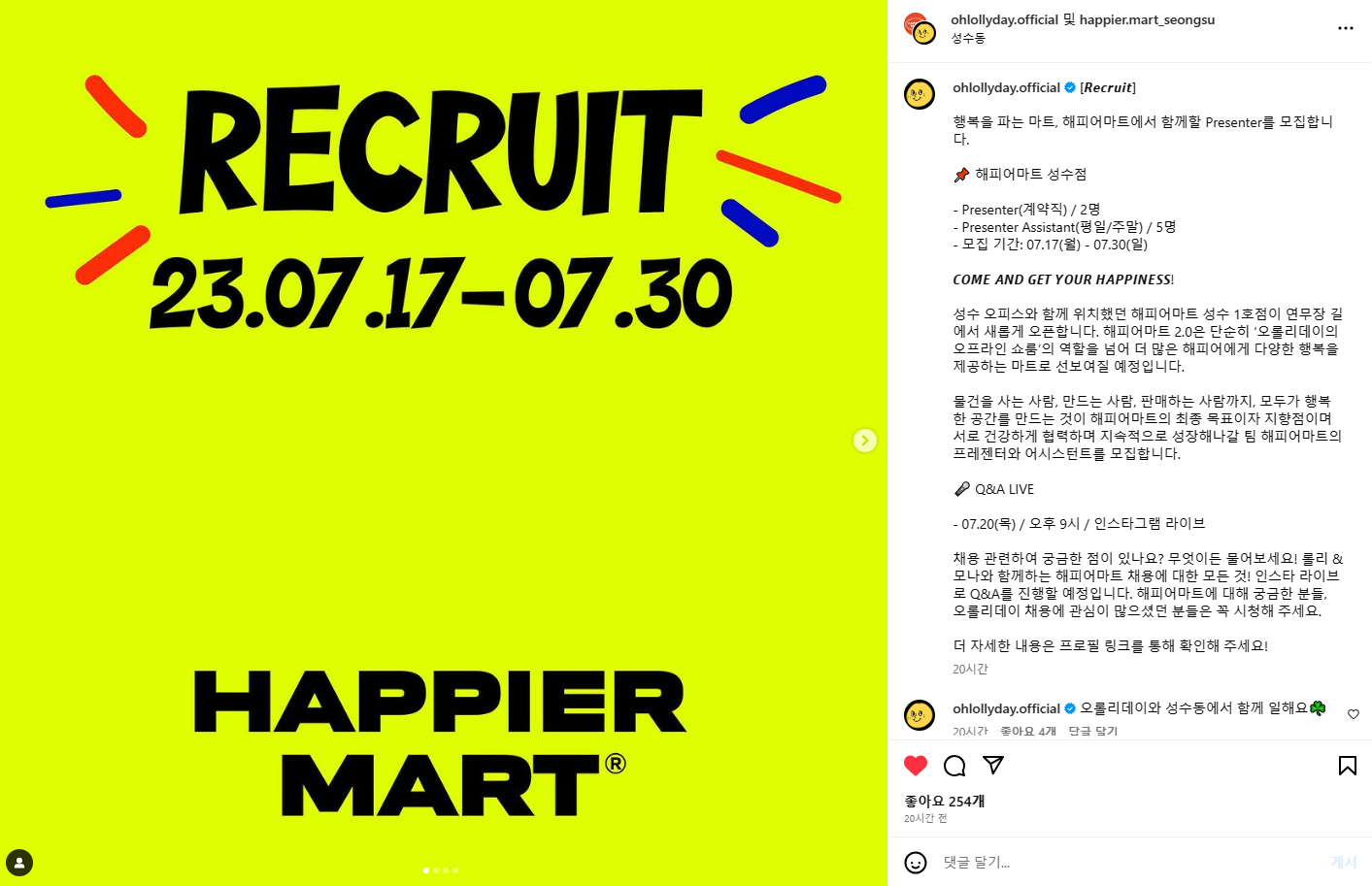 아울러 아래처럼 인스타 스폰서 광고를 통해 채용 공고를 할 수도 있습니다.