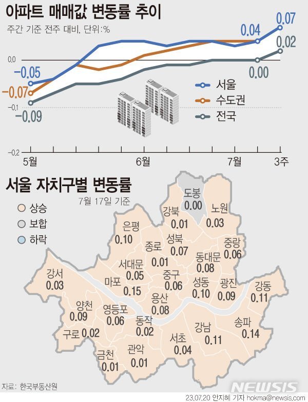 부동산원 관계자는 "선호지역의 주요 단지 위주로 간헐적 상승 거래가 지속되고, 주변 지역으로 가격 상승 기대감이 확산하며 서울 전체 상승폭이 확대됐다"고 설명했다.