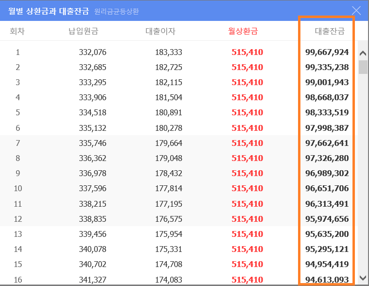 보시다시피 채무(대출잔금)이 회차가 지날수록 감소하고 있는 걸 확인할 수 있습니다. 제가 은행으로부터 처음에 대출받은 채무는 1억원이었지만 이렇게 변동(증가하고 감소)하는 채무를 담보할 때 설정하는 저당이 바로 '근저당'입니다. 등기부등본 상에 있는 근저당권설정은 소유주가 '주택담보대출'을 통해 부동산을 매수했다는 것을 의미합니다. 그리고 대출해준 은행은 근저당권을 설정하여 소유주가 주택담보대출에 대한 원금과 이자를 갚지 않을 수 있는 리스크를 헷지(채무자가 돈을 안 갚을 경우 경매를 신청하고 우선변제를 받을 수 있음)하는 것입니다.
