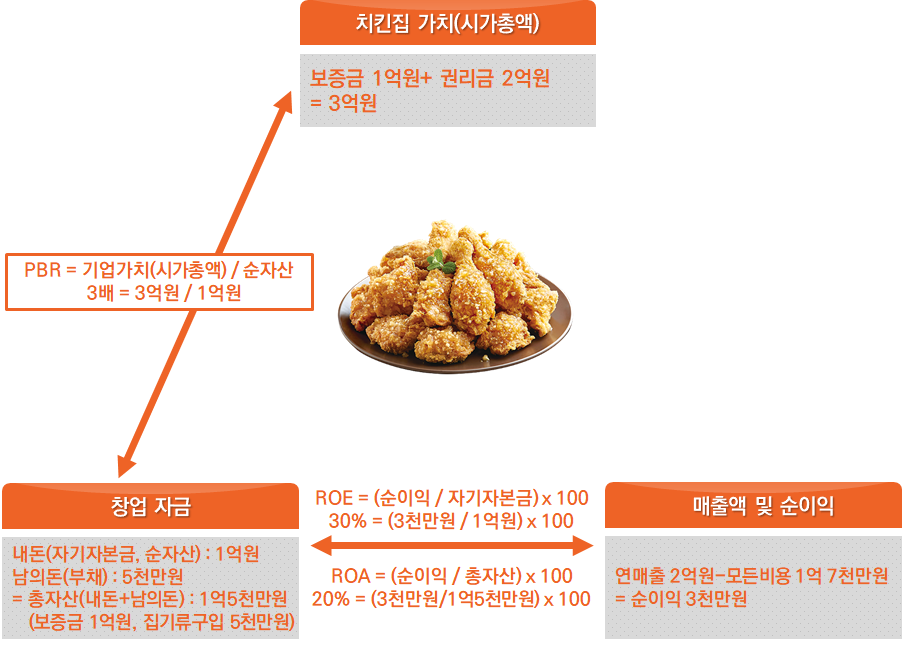 '치킨집 가치'를 '순이익'으로 나눈 수치 = [기업가치(시가총액) / 순자산] = 3억원 / 1억원 = 3배