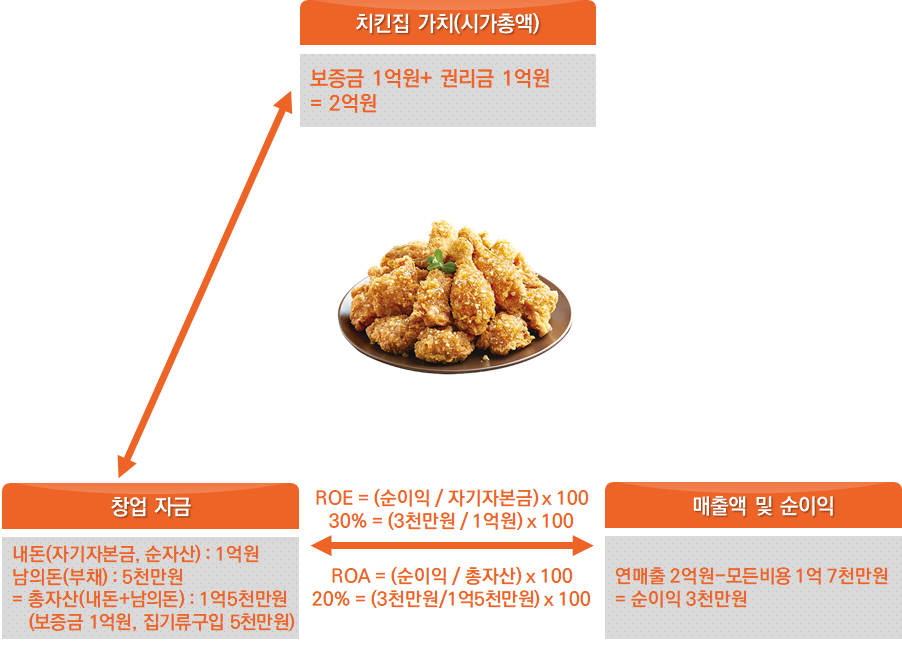 사례) 오랫동안 눈여겨봤던 상가 건물에 치킨집을 1억 5천만원에 창업했습니다. 보증금이 1억이고 치킨집을 세팅하기 위해서는 5천만원 정도가 필요합니다. 하지만 제 수중에 가진 돈을 탈탈 털어도 1억밖에 없었습니다. 때문에 신용대출을 통해 은행으로부터 5천만원을 받아 1억 5천만원의 자금을 확보했습니다. 일단 보증금 1억 원을 건물주에게 드리고, 나머지 5천만원은 내부 시설공사(인테리어)와 치킨을 튀기기 위한 각종 집기류, 치킨의 원료가 되는 닭과 양념 등을 구입하는 데 사용했습니다. 그리고 1년 동안 열심히 장사를 하니 연매출 2억이 되었습니다. 거기서 직원들 인건비 및 각종 재료구입비 등등 이것저것 나가는 돈들을 모두 빼니 3천만원의 순이익이 생겼습니다.
