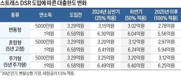 예를 들어 연소득 5000만원인 차주가 30년 만기 분할상환 방식의 변동금리(연 5.04%) 주담대를 받는다면 이제까지는 대출 한도가 3억2900만원이다. 하지만 다음달부터는 3억1500만원, 하반기에는 3억200만원으로 줄어든다. 2025년부터는 2억7800만원으로 지금보다 5000만원 넘게 쪼그라든다.