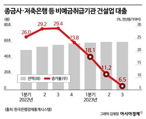 태영건설 기업구조개선작업(워크아웃) 신청 이후 건설업계 자금난은 더 심각해지는 분위기다. 부동산 경기가 침체되기 시작한 작년부터 이런 징조는 뚜렷하게 나타났다. 일반은행들은 물론 저축은행까지 대출을 원하는 건설사들에 빗장을 걸기 시작했다. 2022년까지만 해도 20~30%를 오갔던 건설업 대출 증가율은 작년 3분기에 6~8%까지 떨어졌다.