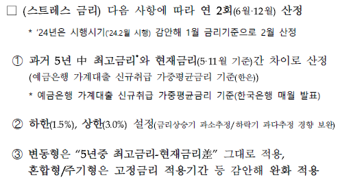 그리고 스트레스 금리 산정을 매월 수시로 하기가 번거로우니 6월과 12월, 연 2회 산정하지만 2024년은 2024년 1월 기준금리로 산정하겠다고 합니다. 즉, 2024년 스트레스 금리는 과거 5년(2019년 1월~2024년 1월) 중 가장 높았던 금리와 최근 금리(2024년 1월 금리)의 차이를 확인한 후, 그 값이 1.5% 이하라면 하한금리 1.5%를 적용하겠다는 것입니다.