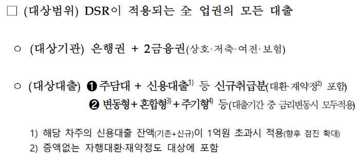 일단 스트레스DSR 적용 대출에는 모든 대출이 적용되지만 예외가 있습니다. 바로 전세대출은 포함되지 않았습니다. 전세대출은 스트레스DSR 대상대출 범위에 포함되지 않습니다.