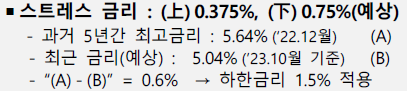 과거 5년 중 최고금리와 현재금리의 차이로 연 2회 산정한다고 합니다. 스트레스 금리 산정 하한은 1.5%이고 상한은 3.0%를 설정해서 한다는데 솔직히 무슨 말인지 잘 모르겠습니다.