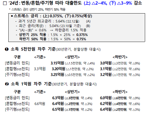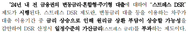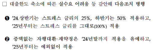 2024년 상반기는 스트레스 금리의 25%, 하반기는 50%를 적용하고 2025년부터 스트레스 금리를 100% 적용한다고 합니다. 대출 갈아타기 및 재약정 등의 경우 2025년부터 적용된다고 합니다.