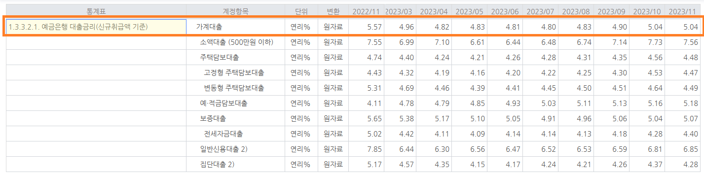 한국은행 경제통계시스템을 통해 한국은행에서 매월 발표하는 '예금은행 가계대출 신규취급 가중평균금리'를 살펴보았습니다.