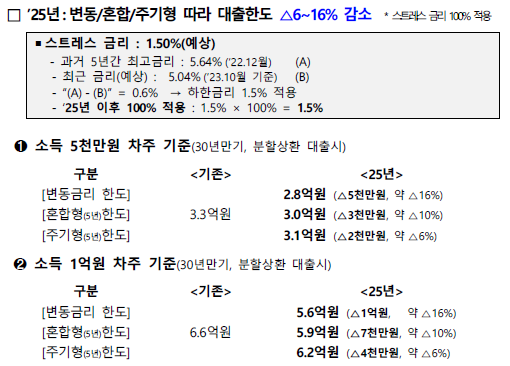 예를 들어 스트레스 금리가 1.5%라면, 2024년 상반기에는 1.5%의 25%인 0.375%를 하반기에는 1.5%의 50%인 0.75%를 적용한다는 의미입니다. 2024년 상반기와 하반기, 2025년을 비교한 대출예상금액을 확인해 보면 다음과 같습니다.