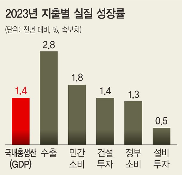 25일 한국은행이 발표한 ‘2023년 4분기 및 연간 실질 국내총생산(속보)’을 보면, 지난해 연간 1.4% 성장 달성에는 하반기 수출 회복 영향이 컸다. 수출 증가가 없었다면 잠재성장률을 밑도는 저성장이 더 심해졌을 것이라는 얘기다.
