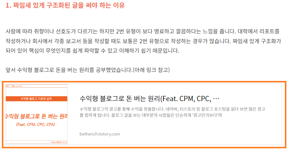 예를 들어 내가 작성한 블로그 글 안에서, 이전에 작성해 놓은 블로그 글을 링크로 남겨 내 블로그에 있는 다른 글을 보도록 할 수도 있습니다. 이런 방식입니다.