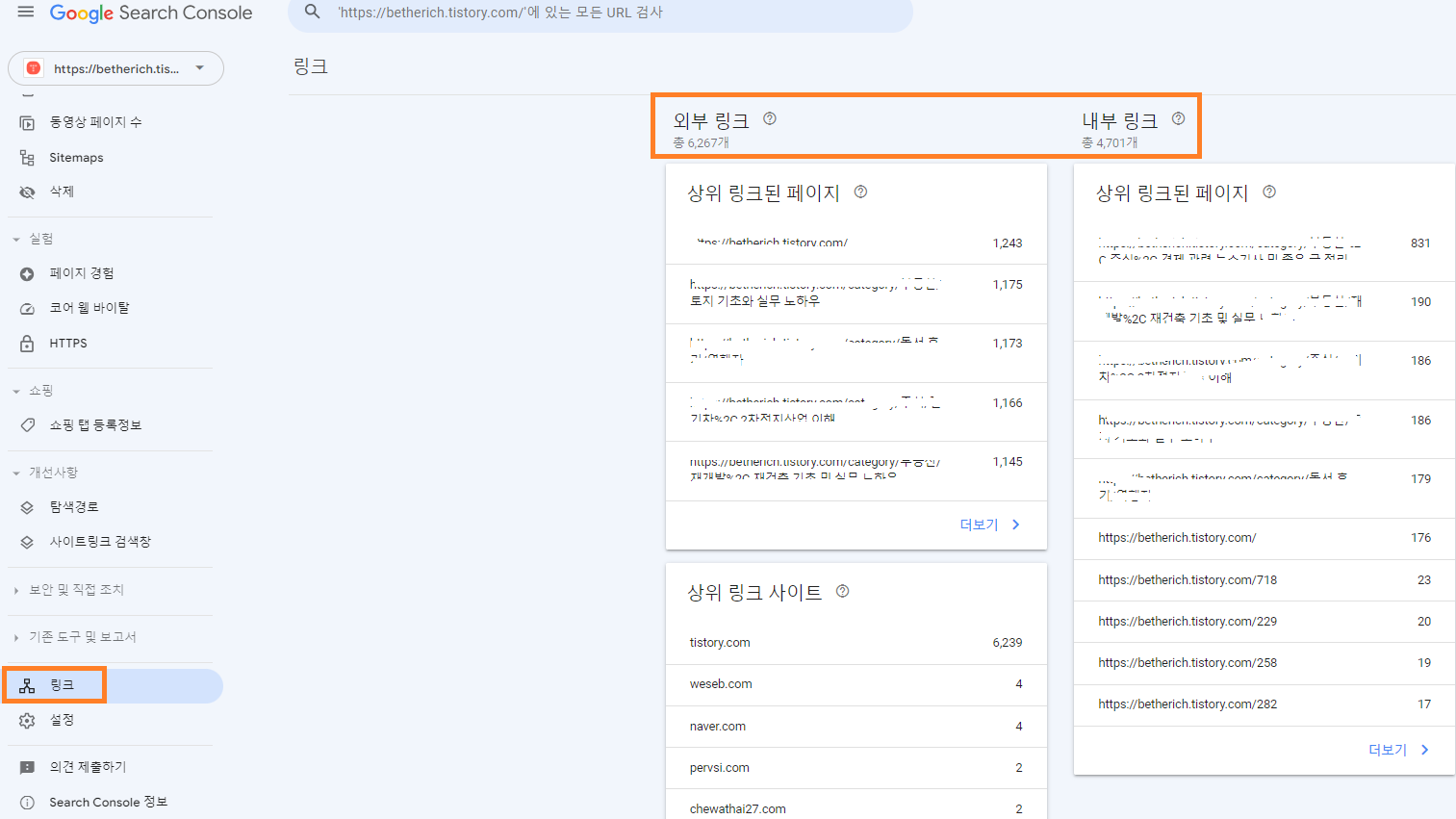 가장 확실한 방법은 구글 서치콘솔을 이용하는 것입니다. 구글 서치콘솔(아래 링크 참고)에 내 블로그를 등록하면 이런 식으로 내 블로그의 백링크 현황을 파악할 수 있습니다.