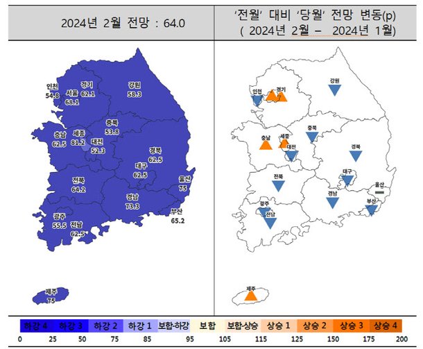 지방에서는 제주, 충남, 세종, 울산을 제외한 모든 지역이 하락세를 보였다. 특히 대구의 전망지수가 1월 80.9에서 2월 62.5로 18.4포인트 떨어지면서 가장 큰 하락 폭을 보였다.
