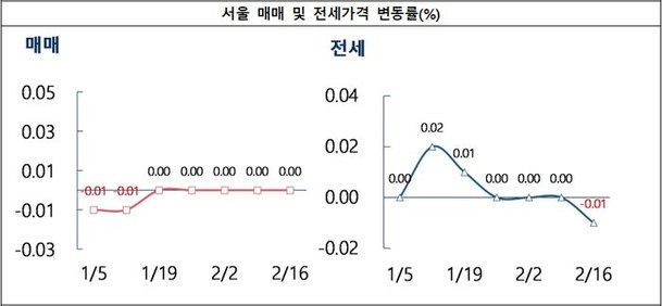 16일 부동산R114에 따르면 설 연휴 영향에 매도·매수 움직임이 사실상 멈춘 가운데, 서울 아파트값이 5주 연속 보합(0.00%)을 나타냈다. 서울 재건축과 일반 아파트 모두 가격 변동이 없었으며, 신도시는 3주 연속, 경기·인천은 4주 연속 보합세를 유지했다.