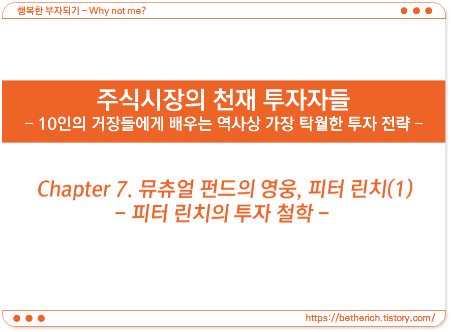 피터 린치를 알게 된 사연을 떠올려 보면 재미있습니다. '전설로 떠나는 월가의 영웅', 마치 무협지와 같은 책 제목을 보면서 이렇게 생각했습니다. "책 이름 진짜 기가 막히게 잘 지었네! 그래봤자 어차피 운 좋아 돈 번 사람인 주제에 생색은..." 사실 그 당시에는 딱히 행복한 부자가 되고 싶지도 않았고(그냥 먹고 살 정도만, 가늘고 길게 살면 된다고 생각했던 때였습니다.) 마음 속에는 시기와 질투, 불만과 체념으로 가득했고, 모든 것에 염세적이고 비관적이었던 것 같습니다.(물론 지금도 가끔씩은 그런 마음이 불쑥불쑥 올라옵니다. 때문에 '부자마인드'를 갖추고자 지속적으로 노력하고 있습니다.)