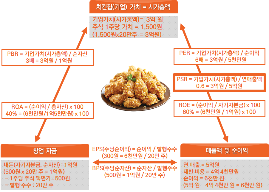 사례) 오랫동안 눈여겨봤던 상가 건물에 치킨집을 창업했습니다. 창업에 필요한 자본금은 대략 1억 원 정도를 생각했습니다. 보다 '책임감 있고 폼도 나게' 운영하고자 법인으로 시작했습니다. 주식을 발행할 준비를 했고 액면가 500원에 주식 20만 주를 발행하여 자본금을 마련하기로 협의했습니다.(500원 x 20만주 = 1억 원) 자본금 1억 원과 은행 부채 등을 합쳐서 보증금 1억 원을 내고 나머지 돈으로 각종 재료와 집기(치킨 튀김기, 닭, 양념 등)를 구입했습니다. 법인 형태로 책임 있게 1년 동안 열심히 장사를 하니 어느덧 연매출 3억 원이 되었습니다. 직원들 인건비 및 각종 재료구입비 등등 이것저것 나가는 모든 돈 2억 7천만 원을 빼니 3천만원의 순이익이 생겼습니다.