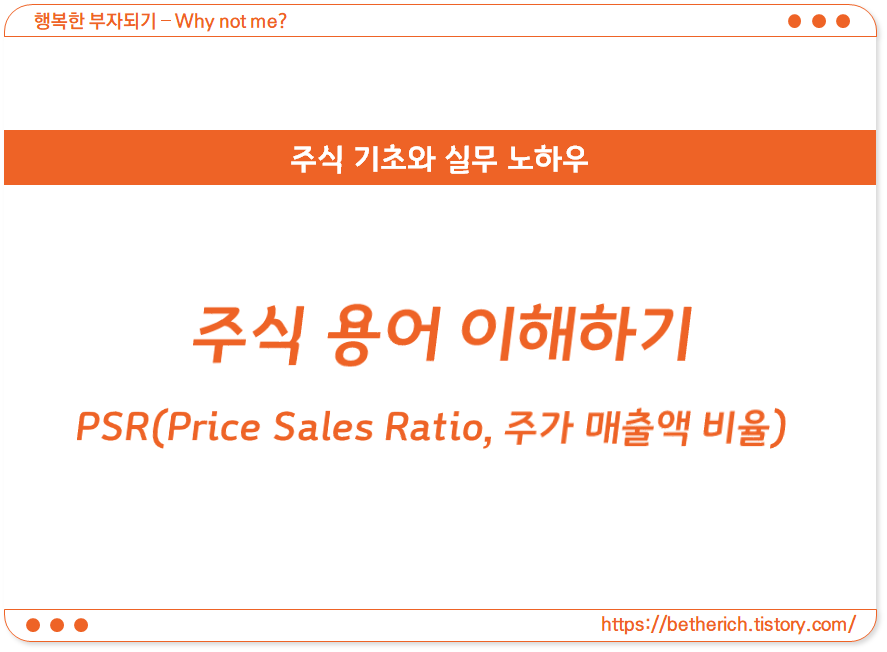 이번에는 PSR(Price Sales Ratio) 입니다. 한글로는 '주가 매출 비율, 주가 매출액 비율' 이라고 부릅니다. 인터넷에 'PSR'로 검색해 보니 '주가를 주당 매출액으로 나눈 수치 또는 시가총액을 기업 총매출액으로 나눈 수치로 계산되며 주가가 매출액의 몇 배가 되는가를 나타낸다.'라고 합니다.(출처 : 네이버 지식백과)