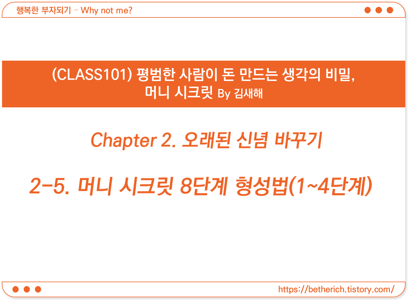 김새해 님께서 알려 주신 머니 시크릿을 형성하는 8단계 중 4단계는 다음과 같습니다.