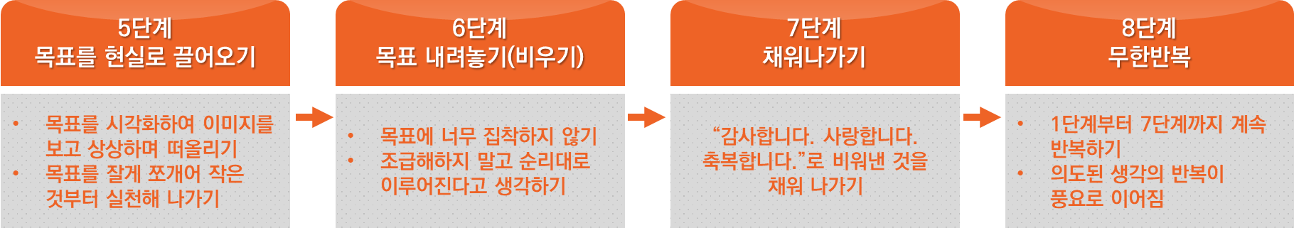 목표를 마음 속으로 생각하는 것도 중요하지만 시각화(이미지화)하여 사진이나 텍스트 등으로 수시로 볼 수 있도록 하는 과정이 필요하다고 합니다. 김새해 님 뿐만이 아니라 자기계발서를 읽다 보면 공통적으로 들었던 말입니다. 핸드폰에, 카드지갑에, 컴퓨터 배경화면에, 벽면에 이미지를 붙여넣으며 그 목표를 이루어낼 수 있다는 확신을 반복해야겠습니다.
