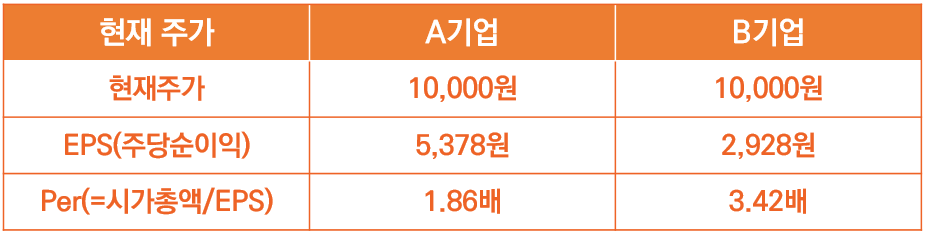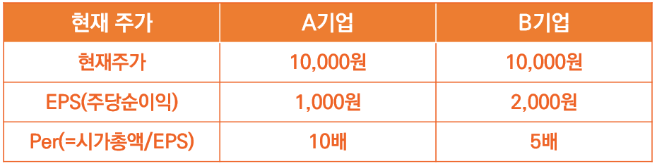 예를 한 번 들어보겠습니다. 주식회사 A와 주식회사 B인 두 기업이 있습니다. 현재 두 기업의 현재주가는 1만원이고 EPS(주당순이익)은 A가 1,000원, B가 2,000원입니다. 그렇다면 Per은 어떻게 될까요? 'EPS x Per = 현재주가' 이기 때문에 아마 이렇게 될 겁니다.