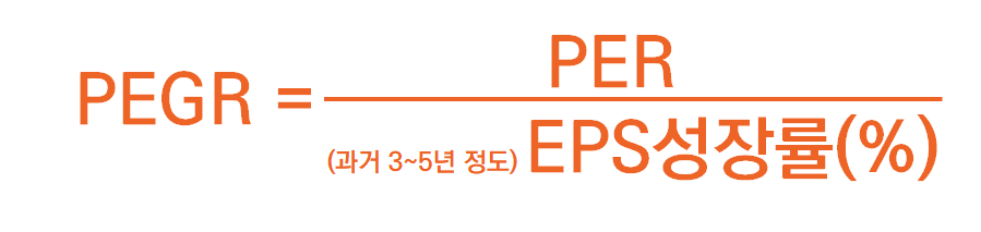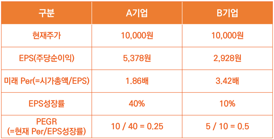 이렇게 PEGR을 구해 보면 A기업은 0.25, B기업은 0.5가 됩니다. 이런 식으로 현재의 Per을 EPS성장률로 나눈 값을 PEGR(Price Earning to Growth Ratio, 주가이익성장비율)이라고 합니다.