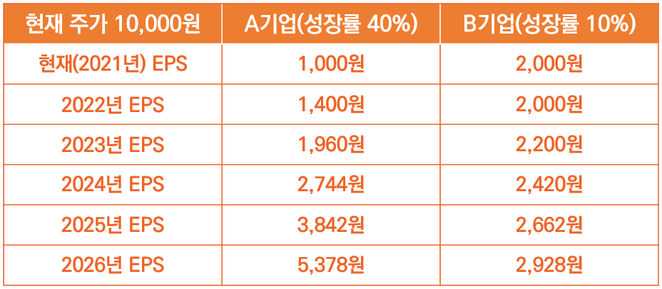 A기업은 지금 당장의 EPS는 낮은 편이지만 4차산업 관련하여 높은 성장이 기대됩니다. 때문에 EPS성장이 매년 40%정도가 될 것으로 예상을 하고 있습니다. 하지만 B기업의 경우 독점적 사업을 하고 있기 때문에 안정적 고객은 확보하고 있지만 신규 고객이 늘어날 확률 또한 별로 없기 때문에 EPS성장은 매년 10% 정도가 되지 않을까 전망하고 있습니다. 이럴 경우를 한 번 가정해 보겠습니다.