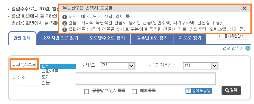 4. 부동산 구분을 체크하면 크게 '집합건물', '토지', '건물'을 선택할 수 있습니다. 세부 내용은 '부동산구분 선택시 도움말'을 참고하여 선택하면 되겠습니다. 보통 '아파트'를 많이 검색하는 경우가 많은데 아파트는 '집합건물'입니다.