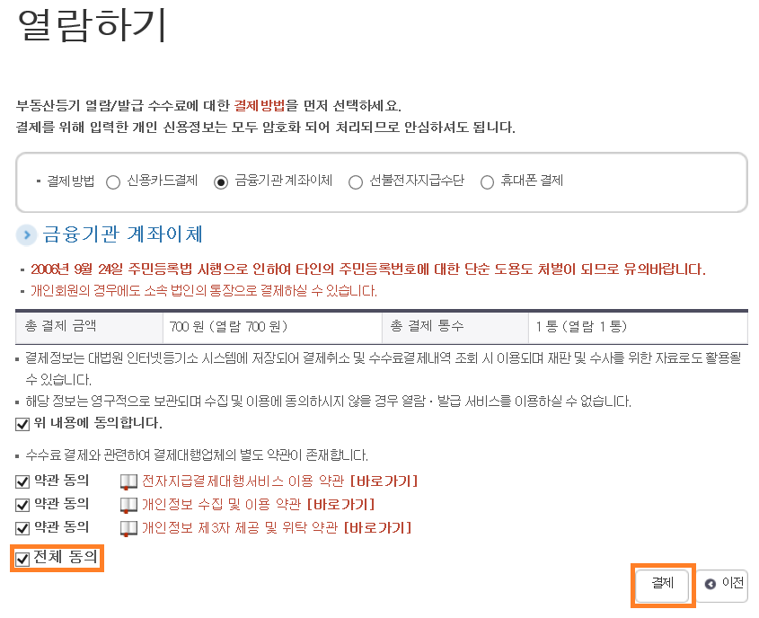 이렇게 결제방법을 선택하고(각 메뉴별로 화면 차이가 있습니다.) '전체 동의' 메뉴를 체크한 후 결제 메뉴를 클릭한 후 열람하면 되겠습니다.