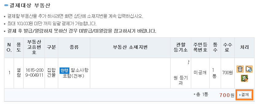 11. 결제대상 부동산을 확인한 후 결제 메뉴를 클릭합니다.