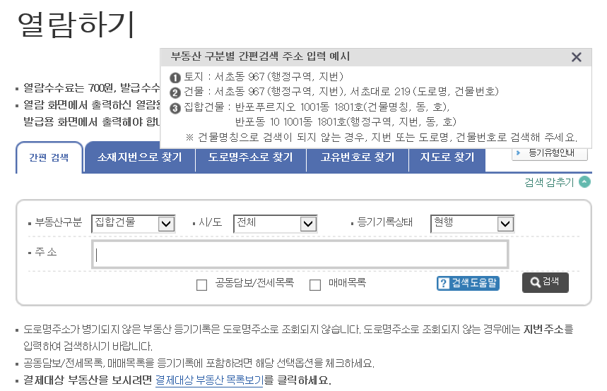 3. 일단 이 메뉴를 클릭하면 이런 화면이 나옵니다. 메뉴가 다양하게 있습니다. 간편 검색, 소재지번으로 찾기, 도로명주소로 찾기, 고유번호로 찾기, 지도로 찾기 등이 있는데 그냥 '간편 검색'으로 찾는 게 편할 것 같습니다.