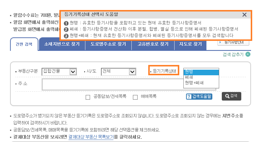 6. 등기기록상태를 체크하면 크게 현행, 폐쇄, 현행+폐쇄 3가지로 있습니다. 이 중에 선택하면 되며, 일단은 저는 '현행+폐쇄'를 선택하려 합니다.