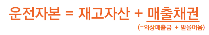 이런 식으로 영업을 하기 위해서는 매출채권이 발생할 상황을 대비하고 재고를 관리하기 위해 자금이 필요할 것입니다. 이 자금이 바로 돈을 버는 활동(영업활동)을 하는 데 필요한 자본', '운전자본'으로 생각하면 됩니다. 때문에 운전자본을 구하는 공식은 아래와 같습니다. 참고로 매출채권은 외상매출금과 받을어음을 합친, 말 그대로 매출로 인해 발생한 채권, 고객으로부터 받아야 할 외상값 정도라고 생각하면 되겠습니다.