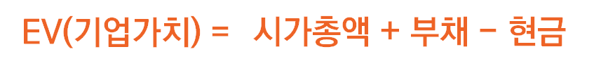 이렇게 시가총액에서 부채를 더하고 현금을 뺀 실질적인 기업가치를 EV(Enterprise Value)라고 합니다. EV를 구하기 위한 공식은 다음과 같습니다.